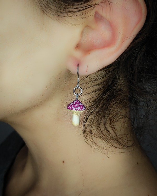 Aros de Amanita Muscaria en miniatura, modelados a mano en arcilla polimérica, con detalles de sombreado pintados y tope laqueados en resina.