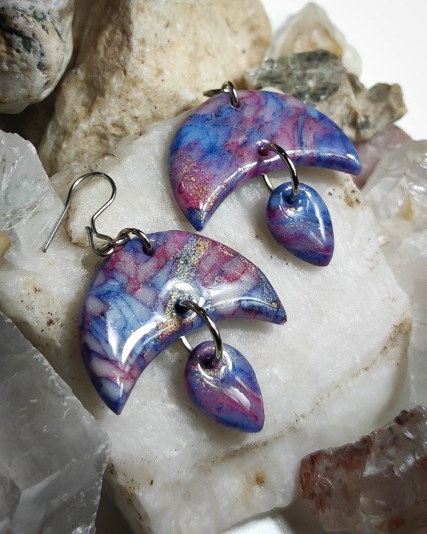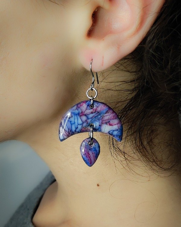 Aritos con forma de luna y gota, hechos a mano en arcilla polimérica con técnica efecto piedra y laqueados en resina. Cada par tiene un patrón único y está inspirado en piedras naturales.