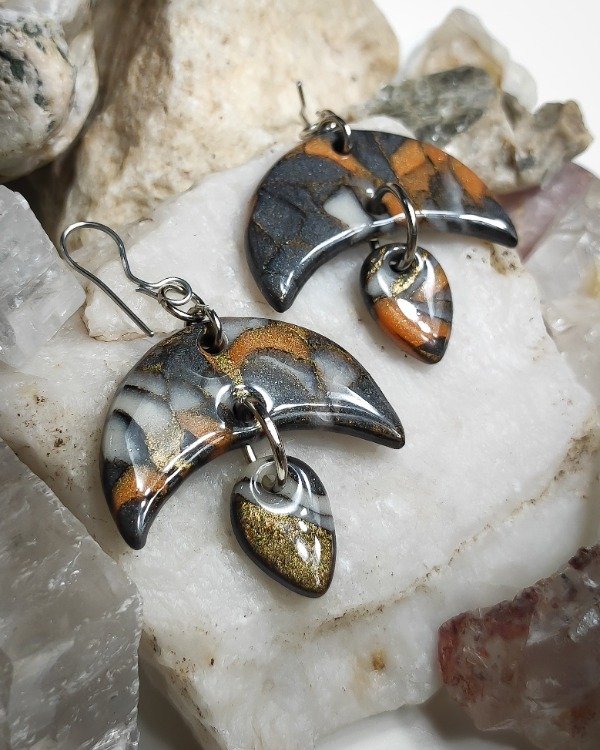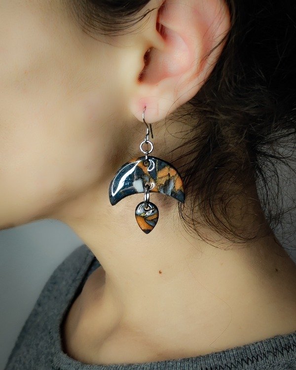 Aritos con forma de luna y gota, hechos a mano en arcilla polimérica con técnica efecto piedra y laqueados en resina. Cada par tiene un patrón único y está inspirado en piedras naturales.
