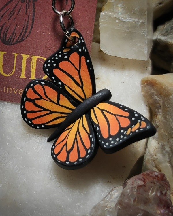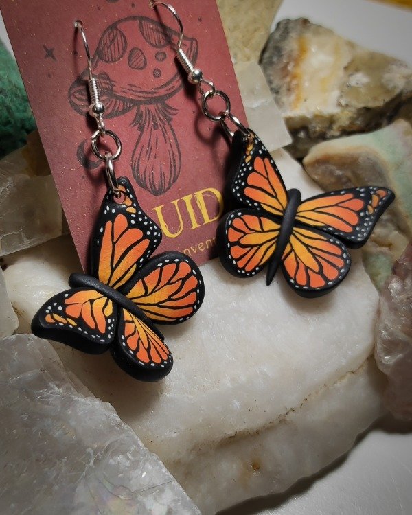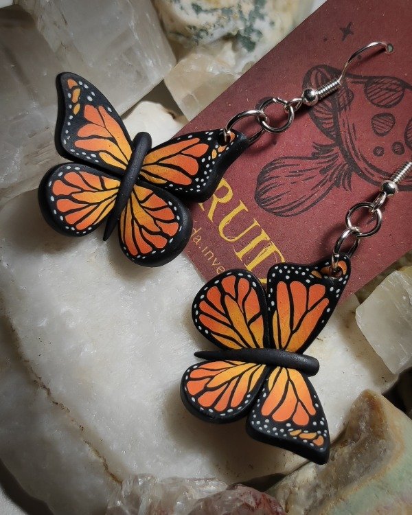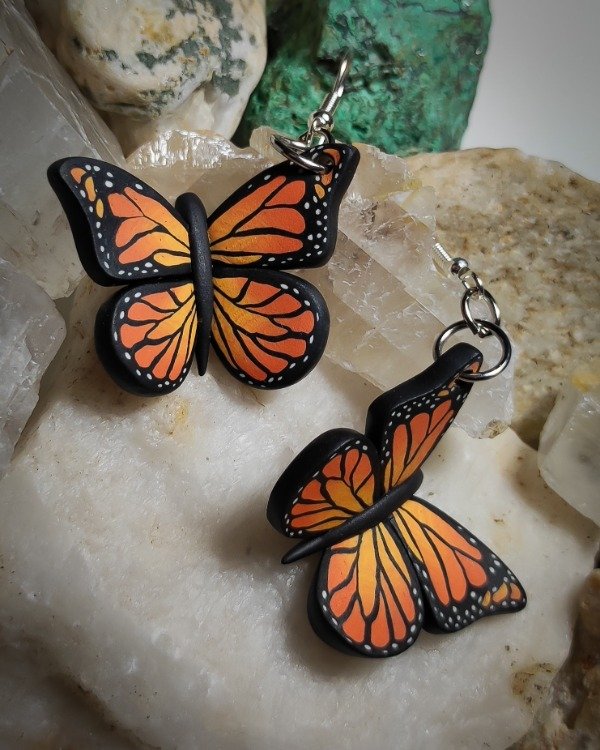 Aros de Mariposa Monarca modelados a mano en arcilla polimérica con técnica cane.