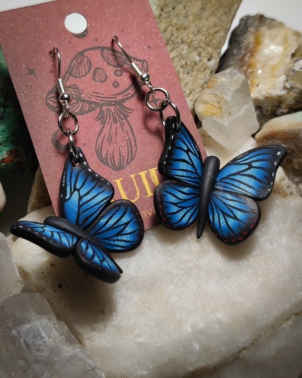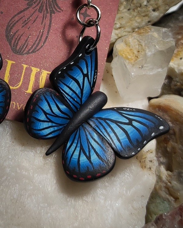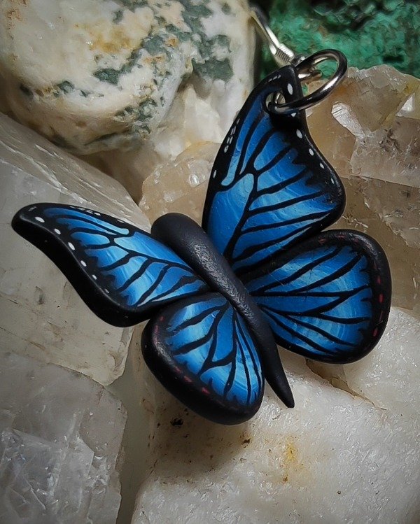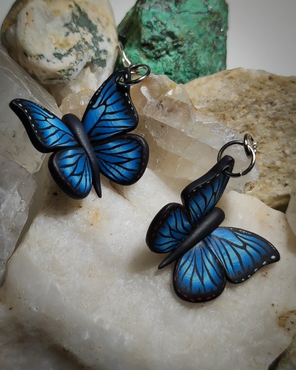 Aros de Mariposa Morpho modelados a mano en arcilla polimérica con técnica cane.