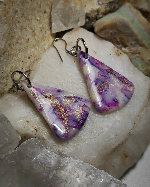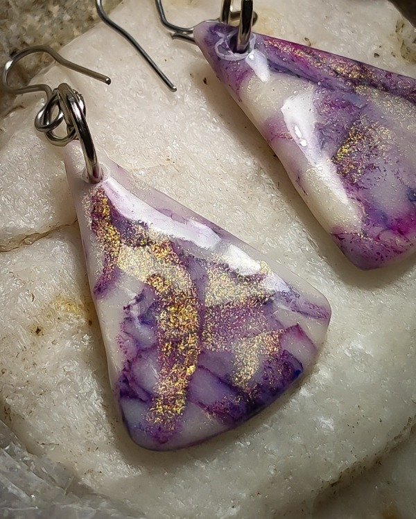 Aritos colgantes Edición Limitada hechos a mano en arcilla polimérica con técnica efecto piedra y laqueados en resina. Cada par tiene un patrón único y está inspirado en piedras naturales.