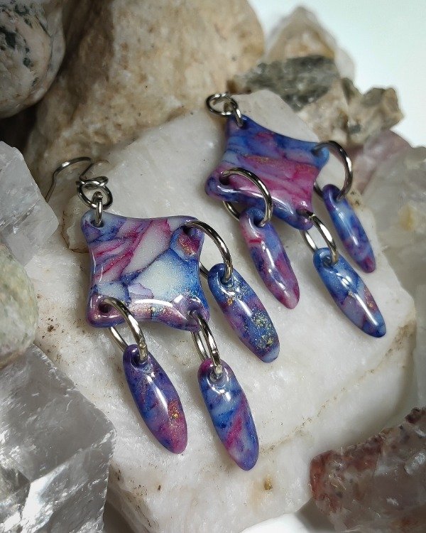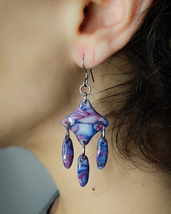 Aritos en forma rombo con colgantes, estilo joyería antigua, hechos a mano en arcilla polimérica con técnica efecto piedra y laqueados en resina. Cada par tiene un patrón único y está inspirado en piedras naturales.