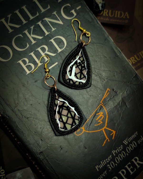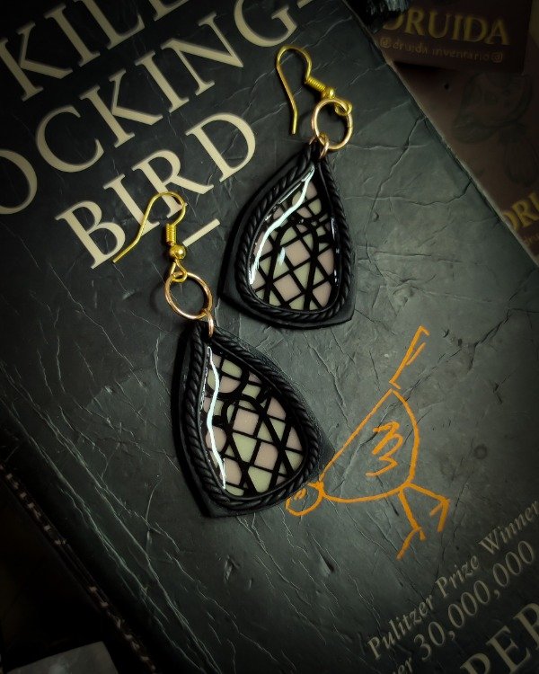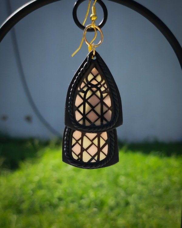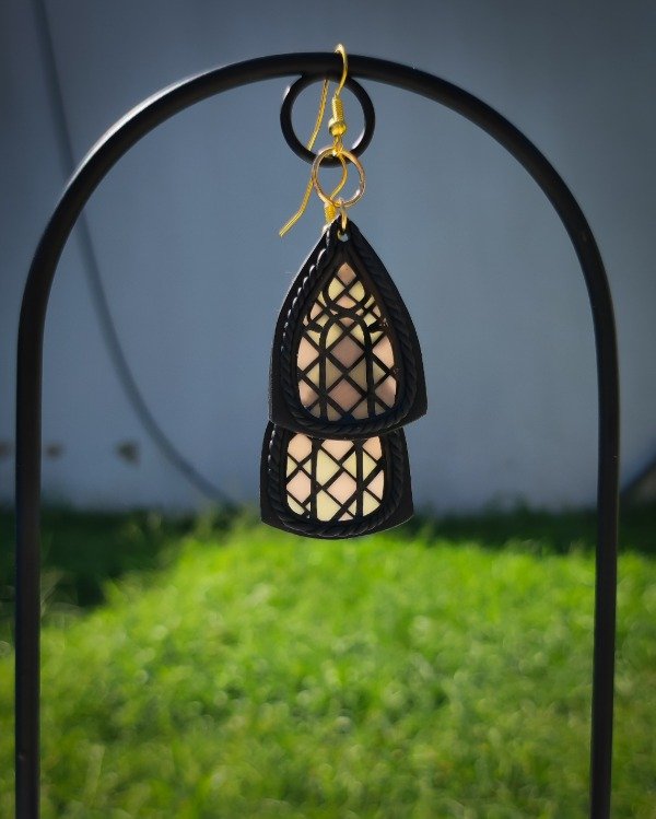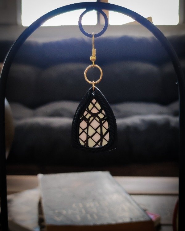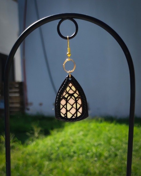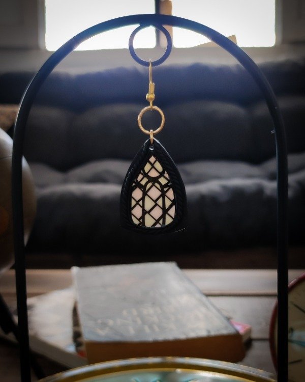 Aros colgantes inspirados en ventanas vitrales modelados a mano en arcilla polimérica translúcida y laqueados en resina.