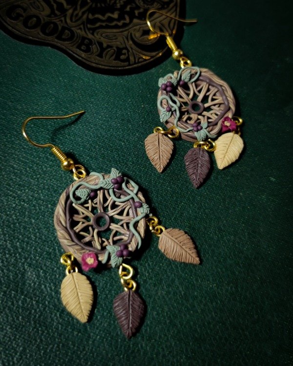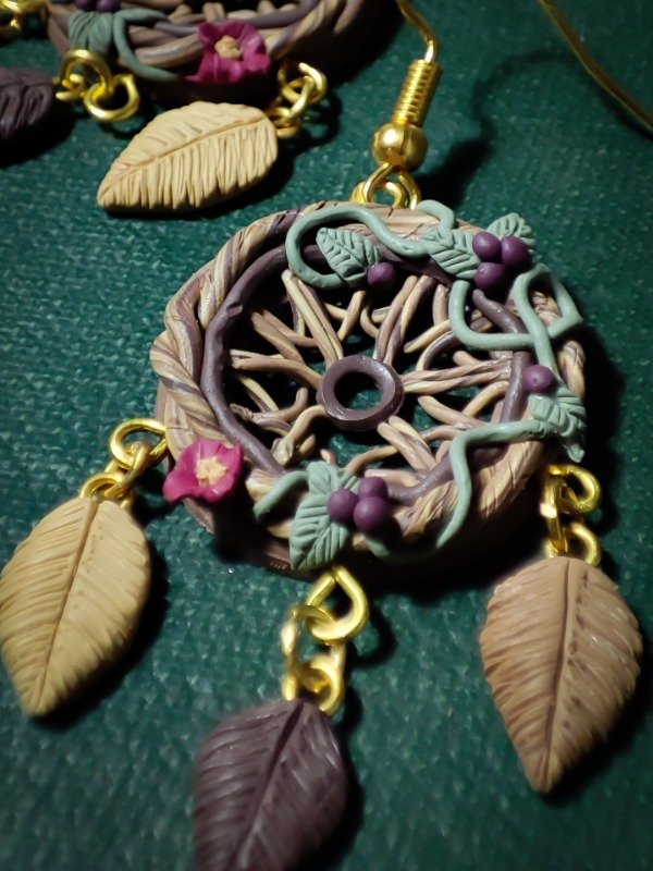 Aros de atrapasueños, con ramas tejidas, flores y plumas colgantes, inspirados en los amuletos del pueblo ojibwa que funcionaban como filtros proctectores atrapando las pesadillas en su tejido.