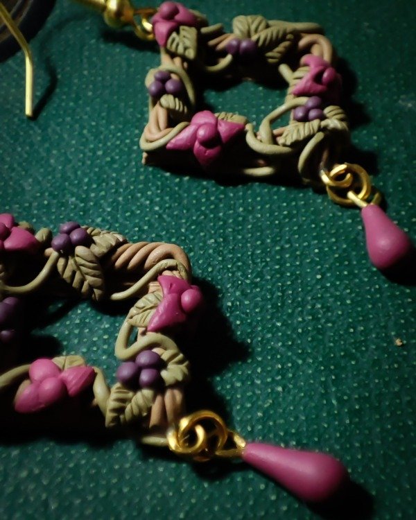 Aros colgantes de corona romboide, con ramas, enredaderas, y flores y frutos de Belladonna, inspirados en las tradiciones celta y nórdica y su uso de esta flor en rituales alucinógenos y los "ungüentos voladores" usados por las brujas