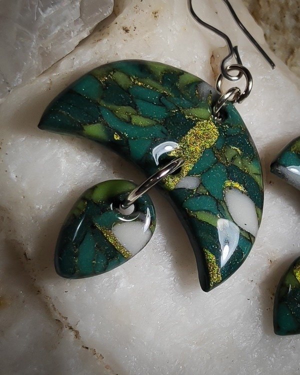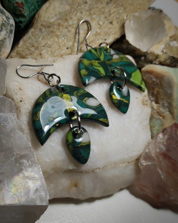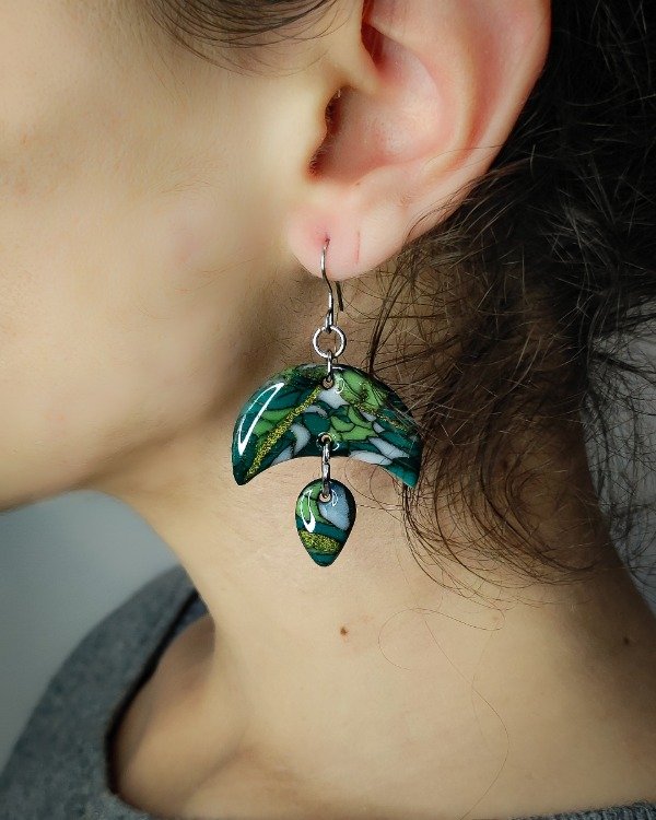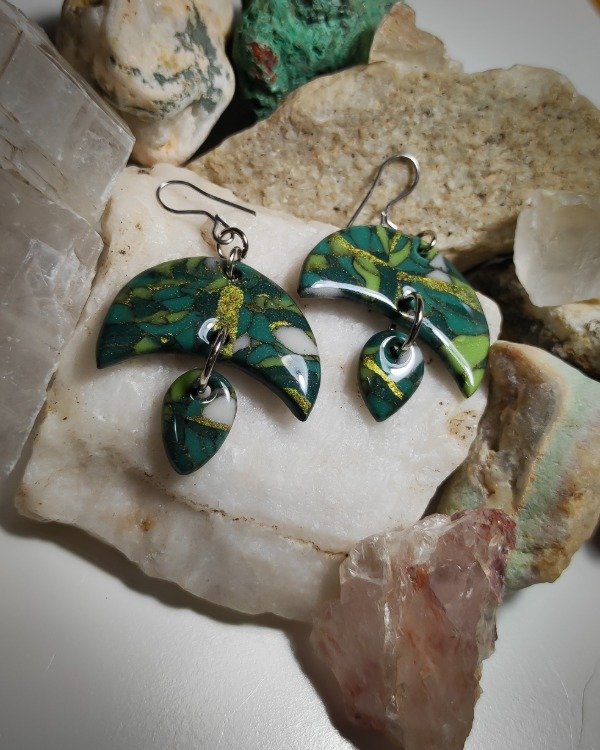 Aritos con forma de luna y gota, hechos a mano en arcilla polimérica con técnica efecto piedra y laqueados en resina. Cada par tiene un patrón único y está inspirado en piedras naturales.